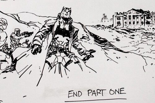 Dunas de arena. Pozos solares humeantes… Esto alguna vez fue Gotham. Ahora, como el resto de la Tierra, pertenece a Darkseid. Sobre la duna, Batman post-apocalíptico con un ejército improvisado de rebeldes —los miembros sobrevivientes de la Justice League— caminan sobre la cresta de una duna para ver la deteriorada Mansión Wayne. Batman los lidera. Flash arrastra lo que queda de Cyborg detrás de él. Bruce mira al cielo, sombrío: "Tenemos que entrar antes de que llegue la noche. Ya viene".