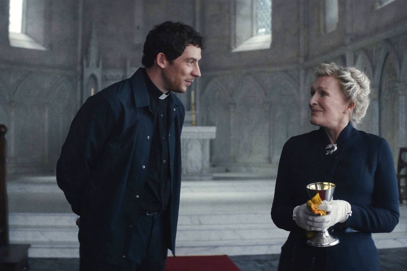 Como en todas las películas de la saga, Rian Johnson utiliza a sus personajes como arquetipos del presente. Cada uno está construido con el nivel de detalle suficiente como para parecer real, pero también representa una postura ideológica reconocible. El conflicto central se articula a través de dos figuras opuestas: el Padre Jud, interpretado por Josh O’Connor, y Monseñor Jefferson Wicks, al que da vida Josh Brolin. Wicks es un líder autoritario que gobierna su comunidad desde el miedo, la mentira y el castigo, mientras que Jud cree en una iglesia basada en la compasión, la ayuda mutua y la gracia. De hecho, este enfrentamiento no solo es personal, sino también profundamente ideológico.