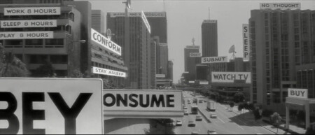 Lo hace a través de unos medios sencillísimos, pero empleados con increíble gusto y gran sentido del humor. La comedia dura del director se lanza contra la sociedad capitalista y la desigualdad, además de contra los cada vez más paródicos espectáculos de acción con héroes soltando latiguillos fabulosamente absurdos como el de Roddy Piper entrando en el banco bien armado.